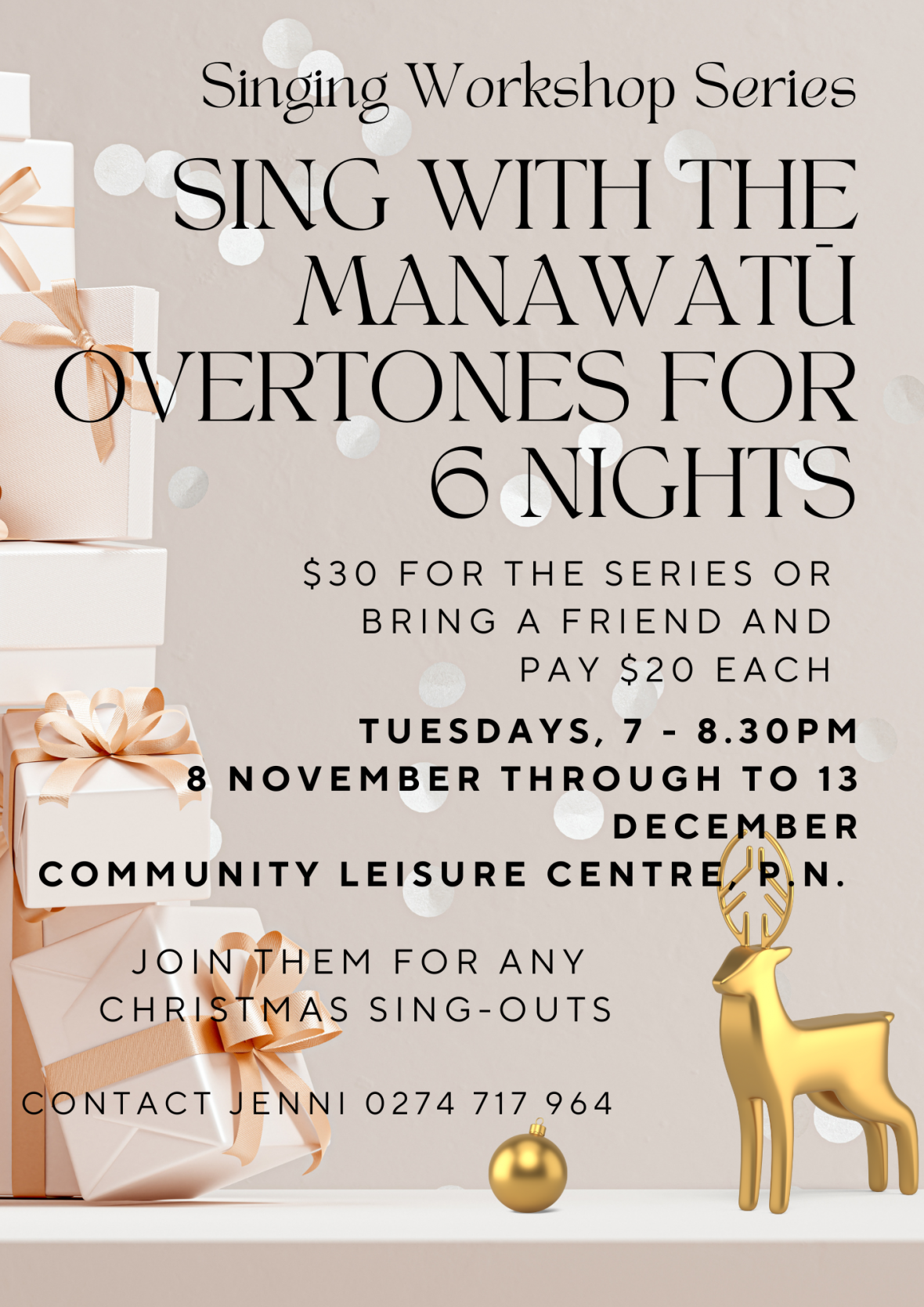 6 Tuesdays from 8 November through to 13 December, 7pm - 8.30pm at the Community Leisure Centre in Ferguson Street, Palmerston North.