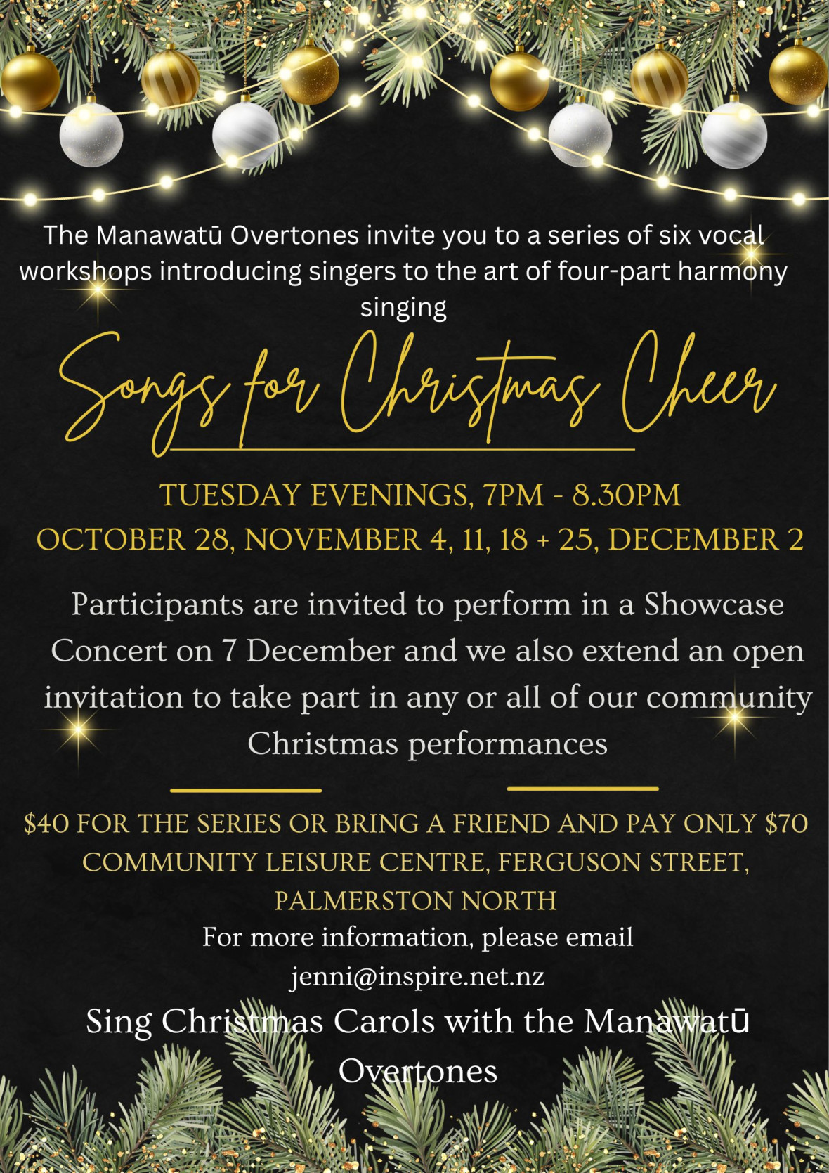 Come and sing carols with us and learn about the art of 4-part harmony singing. Beginning Tuesday 28 October and until December 2, for six Tuesdays, sing with us and perform at any of our community Christmas performances.